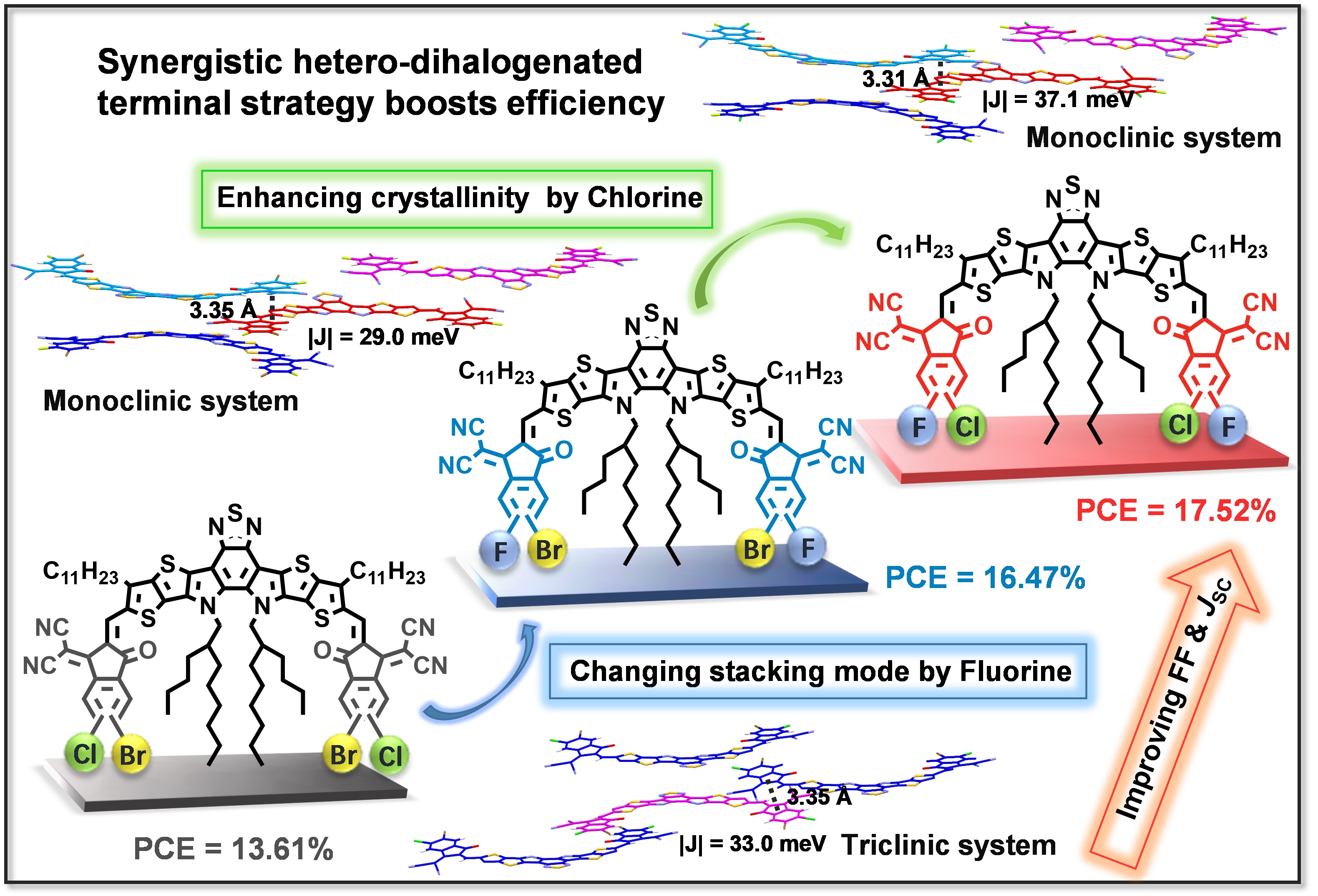 环境污染和能源危机是当今世界面临的两大难题,开发和利用高效率清洁能源是国家能源战略中亟需解决的重大科学问题之一。聚合物太阳能电池凭借其重量轻、机械柔性高、半透明、易于卷对卷印刷等优点,近年来在高效率清洁能源材料领域引起了广泛关注。具有A-D-A或A-DA'D-A结构的新型非富勒烯受体(NFAs)由于其强而广泛的吸收和易于化学改性的特点,在聚合物太阳能电池性能改善方面占据主导地位。目前有许多方法来调节NFAs的分子间堆积、吸收光谱和薄膜形貌。其中利用2个不同类型的卤化端基和不对称的分子骨架策略,被认为是改变吸收范围、优化能级的简单但有效的策略,可以获得更好的聚集态形貌和器件性能。由于缩合反应的可逆性,这些不对称受体通常需要相对复杂的合成和纯化过程来去除副产物。而直接采用具有异双卤原子取代的端基修饰策略和对称的分子骨架策略,有望避免复杂的纯化过程和进一步提高光伏器件性能,但基于异双卤化端基的受体材料鲜有报道。同时,如何通过新颖的末端基和单晶分子堆积模式来调控分子化学结构和聚集形态特征和理解其与器件性能之间的关系,进而开发高效率的新型受体材料,也是聚合物太阳能电池领域一直关注和致力于解决的关键性科学问题之一。