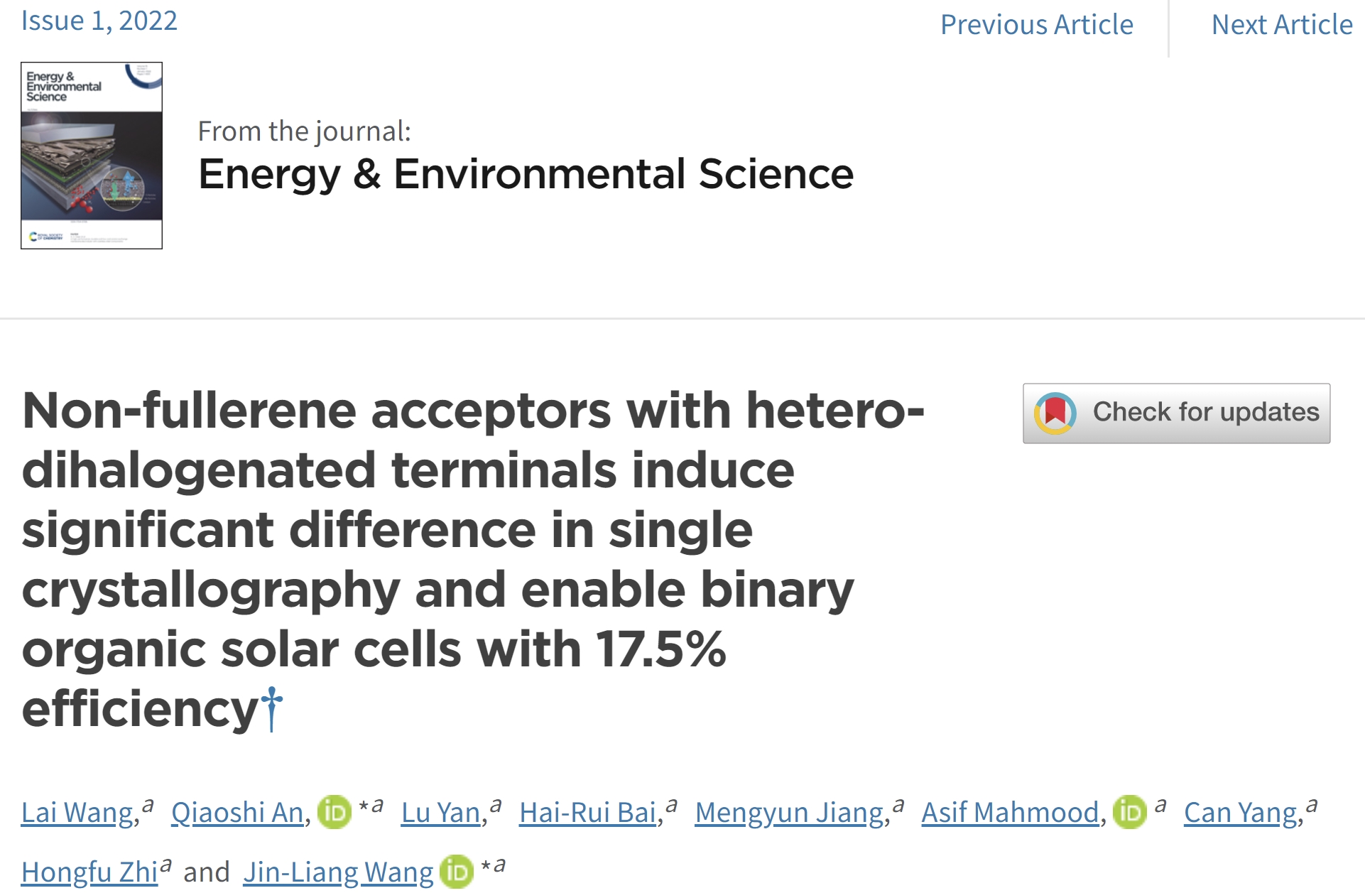 日前,北理工团队在基于异双卤代末端基的聚合物太阳能电池受体材料领域取得进展,相关研究成果以“Non-fullerene acceptors with hetero-dihalogenated terminals induce significant difference in single crystallography and enable binary organic solar cells with 17.5% efficiency”为题,发表在国际顶级能源期刊《Energy & Environmental Science》上(2022, 15 , 320-333)上。化学与化工学院硕士生王来为该论文的第一作者,化学与化工学院王金亮教授和安桥石特别研究员为共同通讯作者,北京成品人和一品二品的区别为唯一通讯单位。