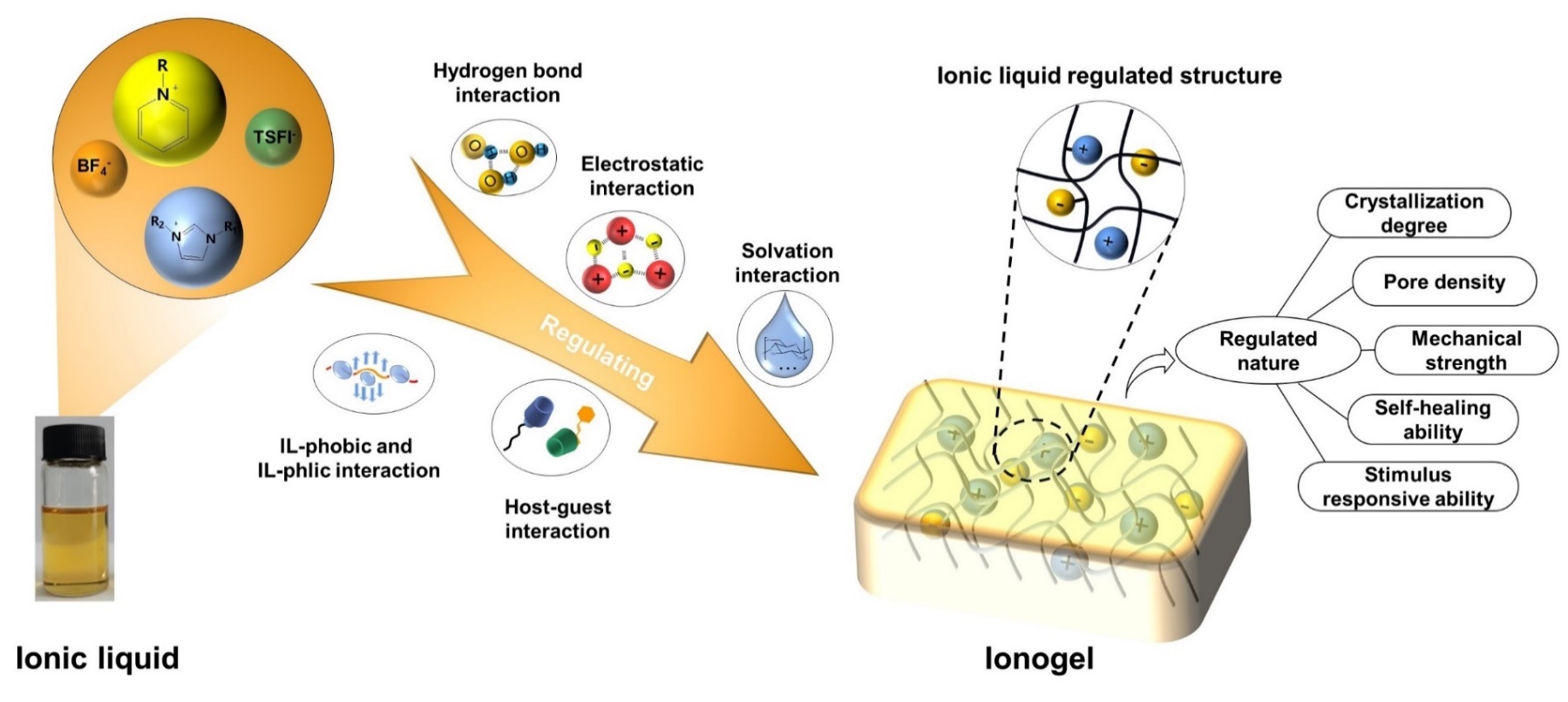 图2. 离子液体调控离子凝胶的结构和性质的示意图