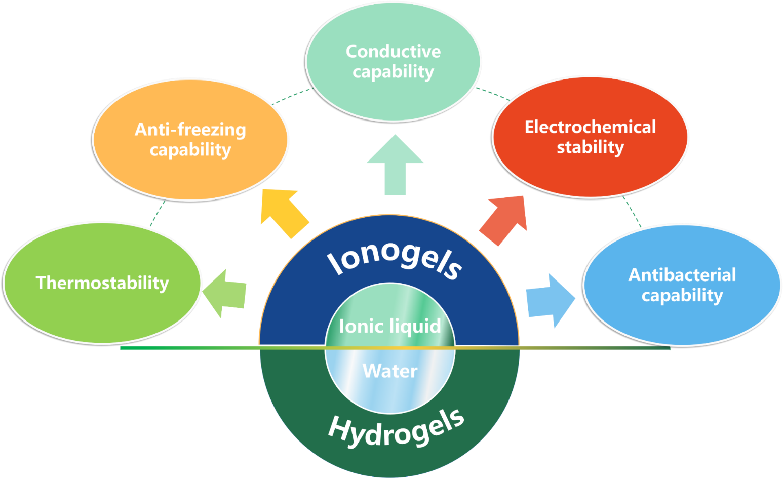 图1. 离子凝胶相比于水凝胶的特殊性能