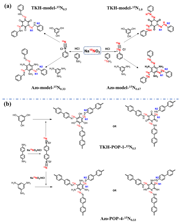 然而,在固态下是否也存在这种三 (β-酮-腙)环己烷的结构,还没有得到科学界的证实。本工作中,该课题组首先以15N标记的亚硝酸钠作为便宜易得的15N源,实现了一半15N 标记(TKH-model-15N0.5)、全15N标记(TKH-model-15N1.0)的模型化合物、以及一半15N 标记的多孔高分子(TKH-POP-1-15N0.5)。作为对比,他们同时制备了1,3,5-三氨基苯与相应的重氮盐偶联产物(Azo-model-15N0.33、Azo-model-15N0.67和Azo-POP-4-15N0.33),发现仍然以偶氮键形式存在。