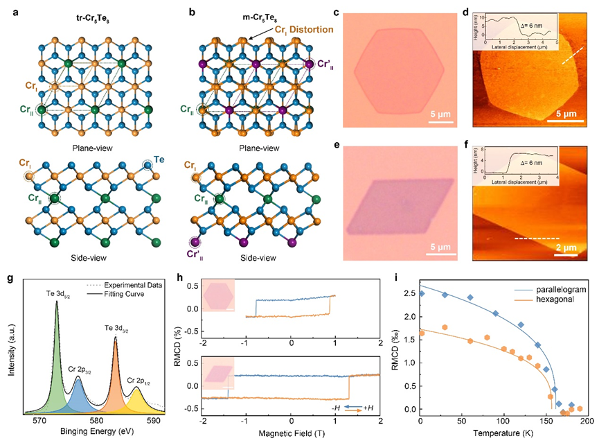 Cr5Te8相结构的可调性源于其三方相和单斜相形成能的差异。三方Cr5Te8属于 P-3m1 空间群,而单斜Cr5Te8属于 C2/m 空间群(图1a-b)。因此,CVD过程中的生长温度对于实现相变至关重要。在较高温度下,三方Cr5Te8将成为主要相,而降低温度则有更利于单斜相的形成。此外,考虑到三方相中Te浓度略高于单斜相(61.5-62.0 at. % Te vs 59.6-61.5 at. % Te),较高的温度也有利于Te前驱体的蒸发,确保足够量的Te反应并进入到Cr-Te基体中,从而获得三方相Cr5Te8纳米片。从光学和原子力显微镜图像可以看出,具有不同相结构的Cr5Te8纳米片由于不同的晶格对称性也展现出了不同的形貌特征,三方相多为六边形,单斜相则多为平行四边形(图1c-f)。XPS和RMCD等表征结果初步确认了纳米片的组分与磁性。三方和单斜Cr5Te8纳米片在低温下都展现出矩形磁滞回线,清楚地表明了其具有垂直磁各向异性的铁磁性。此外,在同等厚度下,单斜相展现出更大的矫顽力和居里温度,表明Cr5Te8晶体中的强相依赖性磁序(图1h-i)。