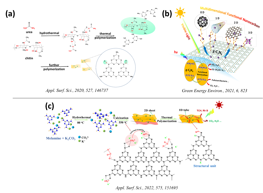 作为一种可见光响应的非金属有机半导体,石墨相氮化碳(g-C3N4)具有合成简单、物化性质稳定、绿色经济、可见光响应、带隙合适等优点,被广泛应用于污水处理、CO2还原、光解水制氢等环境和能源领域。由于原始的g-C3N4存在比表面积低、载流子复合严重、可见光利用率低等问题,需要对其进行结构改性。为此,课题组前期研究了不同改性策略,包括构筑生物质衍生异质结、离子修饰同质结等,以求获得性能优异的g-C3N4基催化剂,并将其应用于水污染治理,能源转化等领域(图1)。例如,利用自然界中广泛存在的海洋类生物质-甲壳素作为碳前驱体,通过一步热聚合法构筑了生物基碳/g-C3N4异质结(CDC/CN),提高了对可见光吸收,促进了载流子的分离,对降解染料的能力有大幅提升(图2a)( Appl. Surf. Sci., 2020, 527, 146737 )。进而,在综述文章中系统总结了现有研究中不同维度碳材料(从零维到三维)与g-C3N4构筑异质结结构异,对于g-C3N4 性能的影响机制(图2b)( Green Energy Environ., 2021, 6, 823 )。为进一步提升异质结的促进效应,整合了离子修饰与异质结的双重优势,发展了K+修饰的1D/2D同质结结构,在处理难降解抗生素污水中表现出良好的潜力(图2c)( Appl. Surf. Sci., 2022, 575, 151695 )。