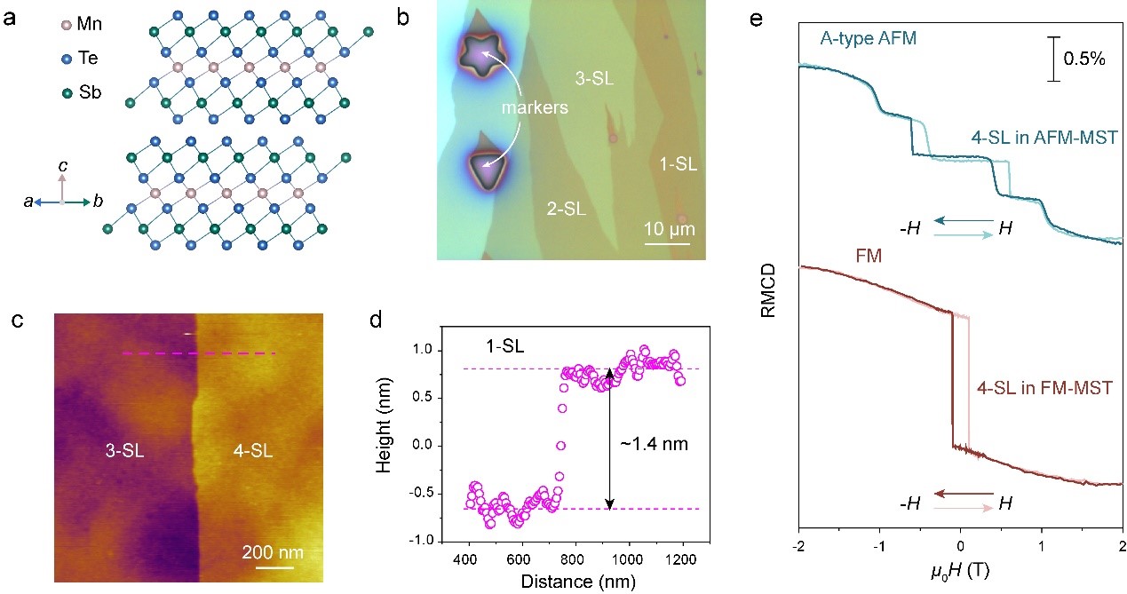 图1(a)MnSb2Te4原子结构图;(b~e)少层样品表征以及四层反铁磁相和铁磁相MnSb2Te4的磁演化