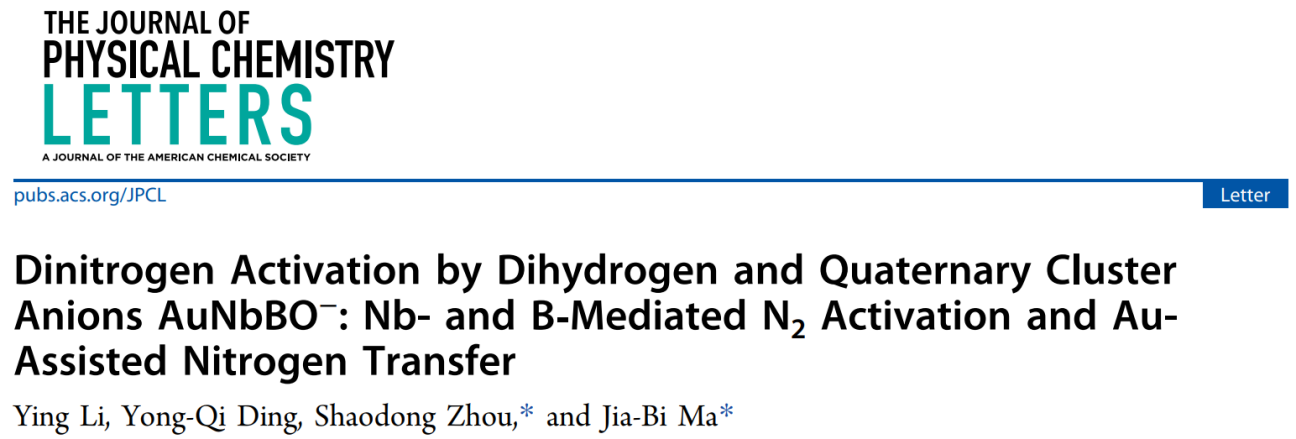 在国家自然科学基金委重大研究计划的支持下,我校化学与化工学院马嘉璧副教授团队在前期的研究基础上,实现了四元团簇AuNbBO−阴离子对N2和H2的有效活化,并生成亚氨基(*NH)单元为主、含少量氨基(*NH2)单元的产物AuNbBON2H2−。在这个反应中,Nb和B原子协同解离N2,Au原子作为还原剂促进转移活化的N原子,从而进行后续氢化过程;三中心二电子键的形成促进了N2活化和N转移。这一研究表明贵金属协同的前过渡金属硼化物团簇对于促进N−N键和H−H键的断裂有着较高的反应性,并且形成了N2氢化反应中重要的中间体,即*NH(或者*NH2)和*NBO单元。这些研究结果为设计用于N2和H2合成NH3的新型催化剂提供了新的思路。