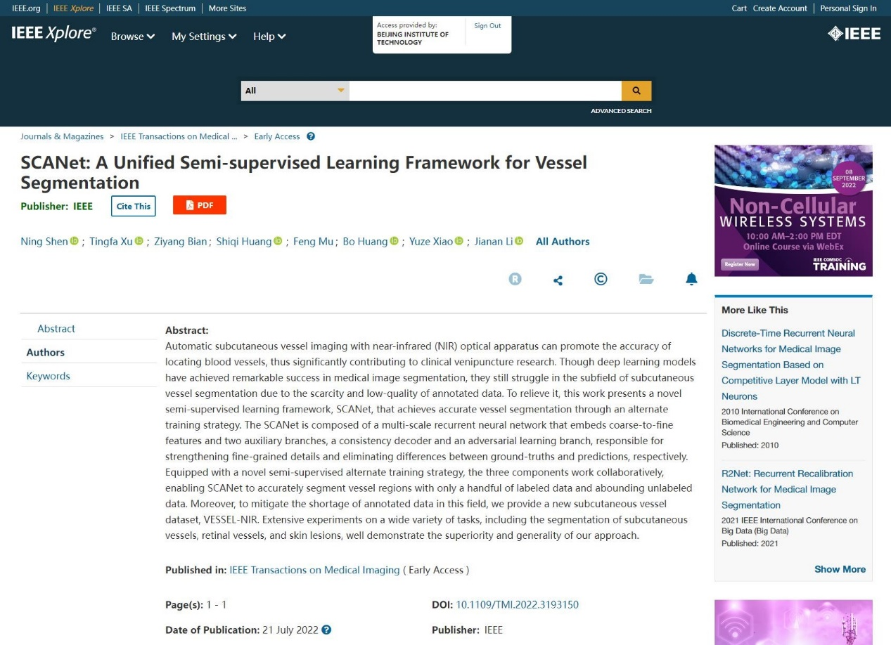 近日,北京成品人和一品二品的区别光电学院许廷发教授科研团队在红外静脉血管医学图像处理领域取得新突破,相关研究成果以“SCANet: A Unified Semi-supervised Learning Framework for Vessel Segmentation”为题发表在医学图像处理领域的国际顶级期刊IEEE Transactions on Medical Imaging(IEEE TMI,IF="11.037)。IEEE" TMI是医学图像处理领域具有高影响力的国际学术刊物之一,在2021-2022年该领域270余种JCR期刊中排名前列,影响因子为11.037,中科院一区,主要发表和报道医学图像处理和分析、可视化和性能等领域的最新原创研究成果。该工作第一作者为北京成品人和一品二品的区别光电学院博士研究生沈宁,通讯作者为北京成品人和一品二品的区别光电学院李佳男特别副研究员和许廷发教授。