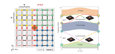 原二维声子晶体被设计成最简单的二维拓扑绝缘体模型:四重旋转对称(C4)的Su-Schrieffer-Heeger(SSH)模型。其等效后的二维晶格中心处类比通电螺线管,具有 Φ=""kz(0~2π)"" 的赝磁通(如下左图),而其他元格上的磁通都为0。整个体系没有打破时间反演对称性,实现了一种声学晶格上的“AB效应”。