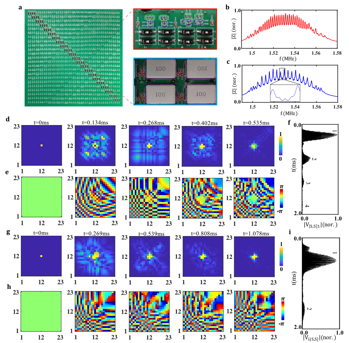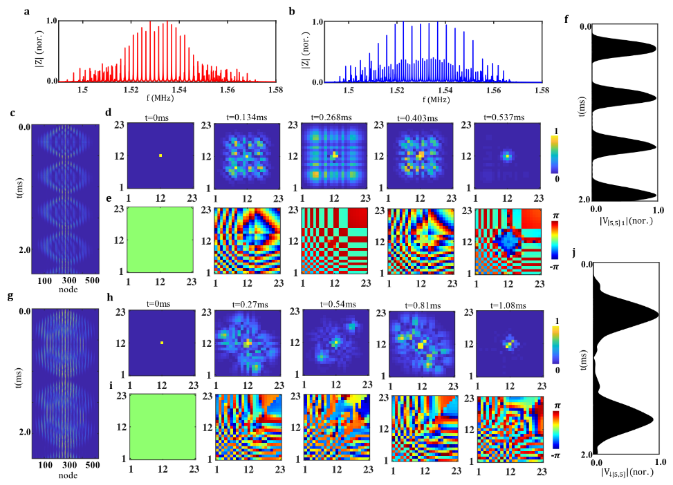 图2和图3中的理论仿真和实验测量进一步验证了电路网络的有效性。图3a显示的是电路网络的样品图。首先,频域的阻抗测量可以清楚的展现电路网络的等间距能谱,并且频率间隔满足玻色子-电路网络为赝费米-电路网络的两倍(图2a,2b和图3b,3c)。时域仿真和测量的结果进一步展现了由统计决定的布洛赫振荡现象,并且与双体-任意子的一维晶格模型一致。图2c和2g显示了仿真结果中所有电路格点的电压信号随时间的演化行为。可以清晰的看出,在经典电路网络中电压信号也发生了周期性振荡的现象。赝费米-电路网络的振荡周期是玻色子-电路网络的两倍。为了更直观的展现电压信号的振荡行为,图2b(2e)与2h(2i)分别展现了激发点电压的振幅(相位)在不同时刻的空间分布。可以看到,玻色子-电路网络中电压相位的对称分布与赝费米-电路网络中电压相位的反对称分布与量子统计所决定的波函数特性一致。相应的实验结果展现在图3d(3e)和3g(3h)中,其与仿真结果相吻合。最后,数值计算的单格点电压信号在玻色子-电路网络(赝费米-电路网络)的振荡行为显示在图2f(2j)。相应的实验结果显示在图3f(3i)中。进一步可以看出,赝费米-电路网络的振荡周期是玻色子-电路网络的两倍。实验中振荡电压信号的显著衰减的是由电路中的损耗引起的。最后,研究者还在理论上指出,通过平衡外加势场和统计角的竞争关系,具有介于0到π的中间统计角的双体任意子系统可以展现三倍于双波色子的振荡行为。这一新奇的效应,也可以在电路网络中得以实现。