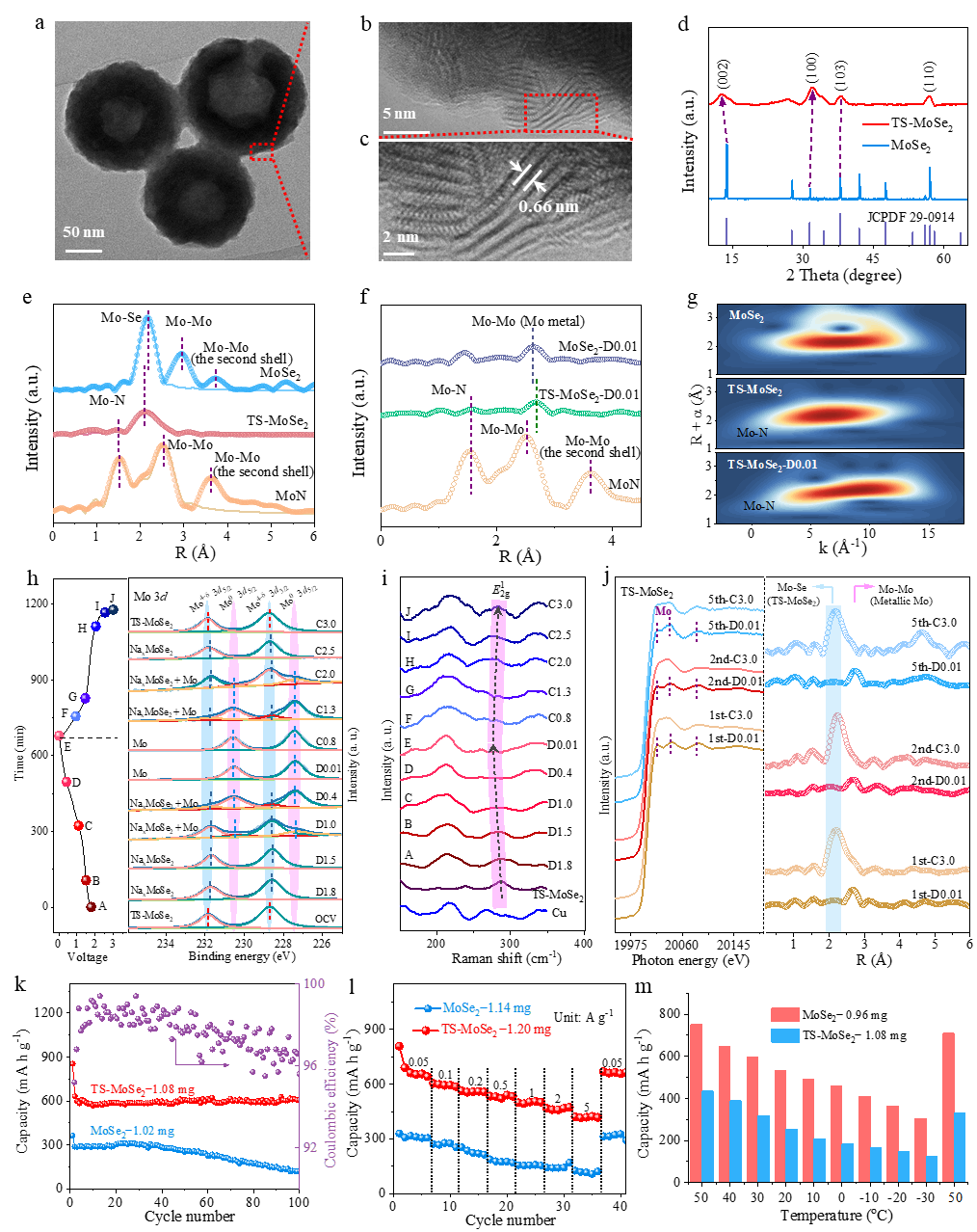 图1.(a-c)TS-MoSe2的表征;(d-g)TS-MoSe2、MoSe2与相应的放电产物TS-MoSe2-D0.01、MoSe2-D0.01的表征;(h-j)TS-MoSe2的钠存储机理表征;(k-m)TS-MoSe2与MoSe2电极的电化学性能。