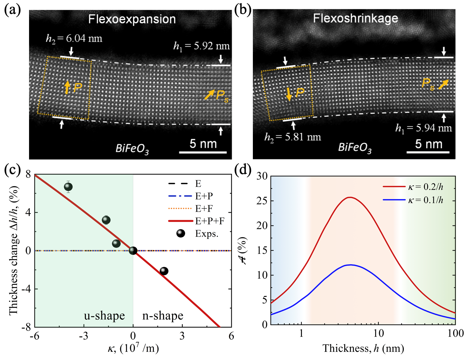 图2. (a,b)铁电薄膜中依赖于自发极性取向的非对称弯曲厚度膨胀/收缩力学行为。(c) 依赖于薄膜弯曲曲率的厚度。(d) 非对称弯曲刚度的尺寸效应。