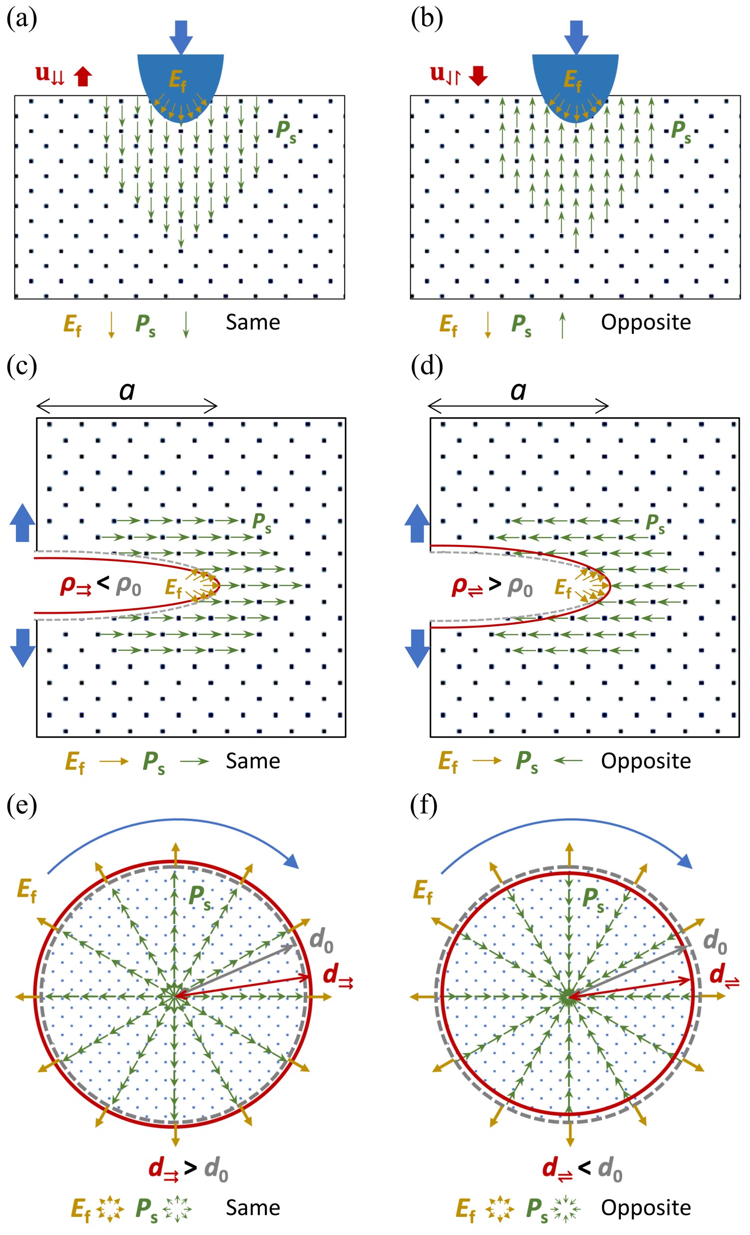 图3. 挠曲形变效应在铁电体中诱导的(a,b)非对称纳米压痕,(c,d) 非对称裂纹扩展现象,以及预测的(e,f) 非对称扭转力学行为。