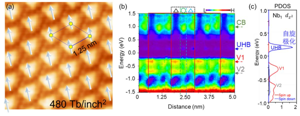 研究了莫特态的上哈伯德能带(UpperHubbard Band,UHB)和CDW的轨道之间的空间反相分布关系,测量并阐明了单层1T-NbSe2每个CDW格点在UHB态的能量具有自旋极化特性,可作为低功耗的信息存储点。信息点间距为1.25nm,自旋信息存储密度高达480 Tb/inch2 (每平方英寸480兆兆比特)。