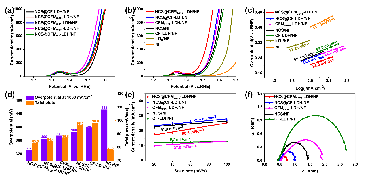 图3. (a) NCS@CFMx (x = 0, 0.025, 0.05, 0.075 和 0.1)-LDH/NF 的OER极化曲线。 (b, c) 不同样品的OER极化曲线和Tafel斜率。(d) 不同样品的性能对照图。 (e, f) 不同样品的Cdl和EIS图。