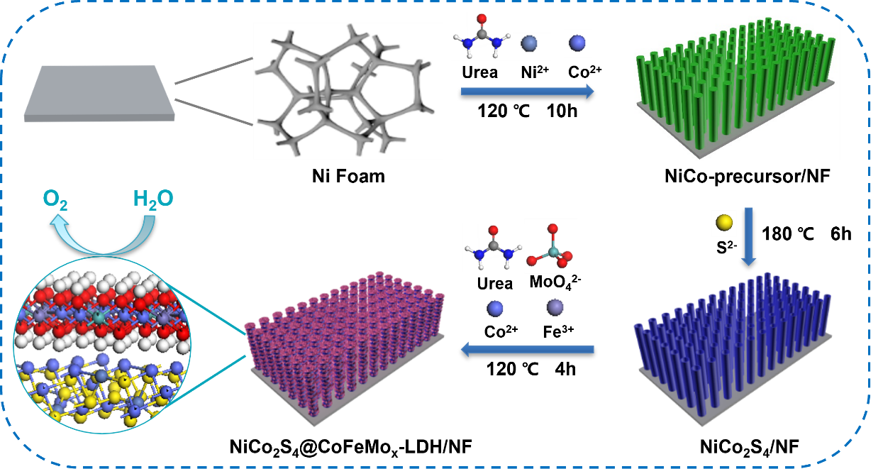 图1. NiCo2S4@CoFeMox-LDH/NF的合成方案示意