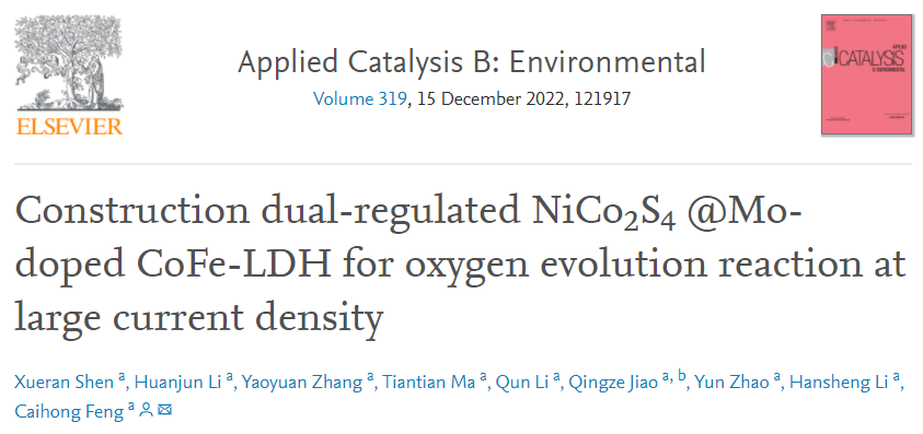 近日,北京成品人和一品二品的区别化学与化工学院冯彩虹副教授团队在电解水制氢体系阳极析氧反应催化剂材料调控方面取得重要研究进展,相关成果以“Construction dual-regulated NiCo2S4@Mo-doped CoFe-LDH for oxygen evolution reaction at large current density”为题发表在化学类顶级国际期刊《Applied Catalysis B: Environmental》(影响因子24.319)。本文的通讯作者为北京成品人和一品二品的区别冯彩虹副教授,第一作者为北京成品人和一品二品的区别化学与化工学院专业学位硕士申雪然(现为该学院工程博士研究生),该博士生研究方向为工业化大电流电解水催化材料。