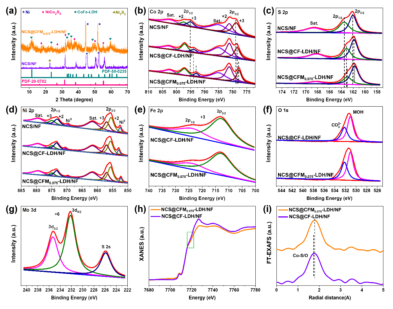 图2. (a) NCS/NF和NCS@CFM0.075-LDH/NF的XRD谱图。(b-g) NCS、NCS@CF-LDH和NCS@CFM0.075-LDH的XPS谱图。(h, i) NCS@CF-LDH/NF和NCS@CFM0.075-LDH/NF在Co-K边得XANES和EXAFE谱图。