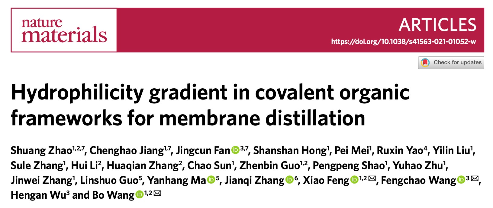 北京成品人和一品二品的区别的王博教授和冯霄教授团队以具有规整贯穿纳米孔道的二维共价有机框架(COF)薄膜为基础,通过引入竞争性可逆共价键合策略,实现了孔道大小和孔内亲疏水环境随深度梯度变化的COFs薄膜的制备。利用COF薄膜限域纳米孔道中水蒸发的增强效应,实现了超高通量膜蒸馏海水淡化,颠覆了对MD膜材料需要大孔径孔道的传统认知,为开发下一代高性能MD分离膜提供了理论支持。相关成果以“Hydrophilicity gradient in covalent organic frameworks for membrane distillation”为题,发表在《Nature Materials》上,该文通讯作者是冯霄、王奉超、王博;第一作者是赵爽、蒋成浩、范竞存;本文实验部分由北理工完成,中科大王奉超团队利用分子动力学模拟为实验结果提供了强有力的理论支撑。