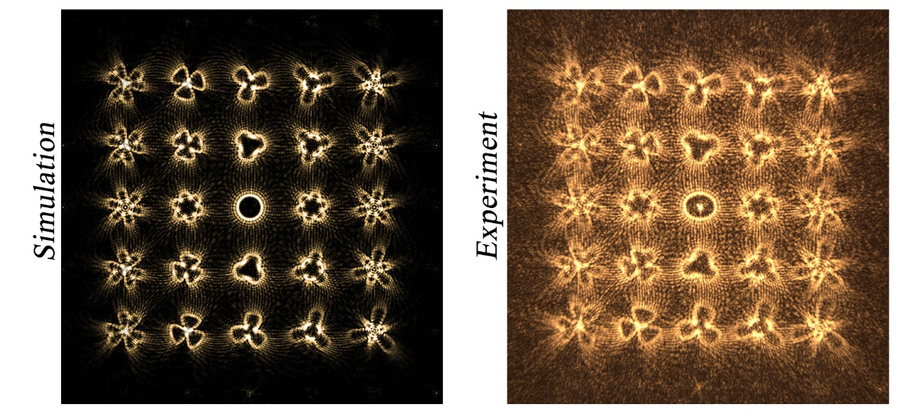 为了利用全光手段实现函数微分和四则运算功能的结合,黄玲玲教授团队应用广义涡旋光束的设计方法,结合达曼涡旋优化,通过设置自定义的相位微分基本函数,实现了不同衍射级次的多种微分函数加减运算的直观光学展现。以三角函数为例,类比于傅里叶级次方法对任意周期函数的展开表达,利用中心基本拓扑荷的相位微分、横向与纵向相位微分函数变化的结合,实现了不同衍射级次上不同函数特征的分布。并且,根据广义涡旋光束相位微分与光束形态之间的关联,不同衍射级次上的各异函数变化呈现为不同的光束轮廓,构成了丰富多样的阵列图案,实验验证单次同时计算显示的各异涡旋光束阵列可多达7×7。相比于传统光计算,该方法实现了函数微分加减运算的直观图像化表达,并且这种新型的函数式微分加减计算功能突破了传统光学计算围绕特定三角函数数值进行分析的局限。此外,针对单个光束的闭合圆周覆盖连续自变量范围以及多个光束之间的微分加减运算关联都使得光计算拥有更强的灵活性和功能性。