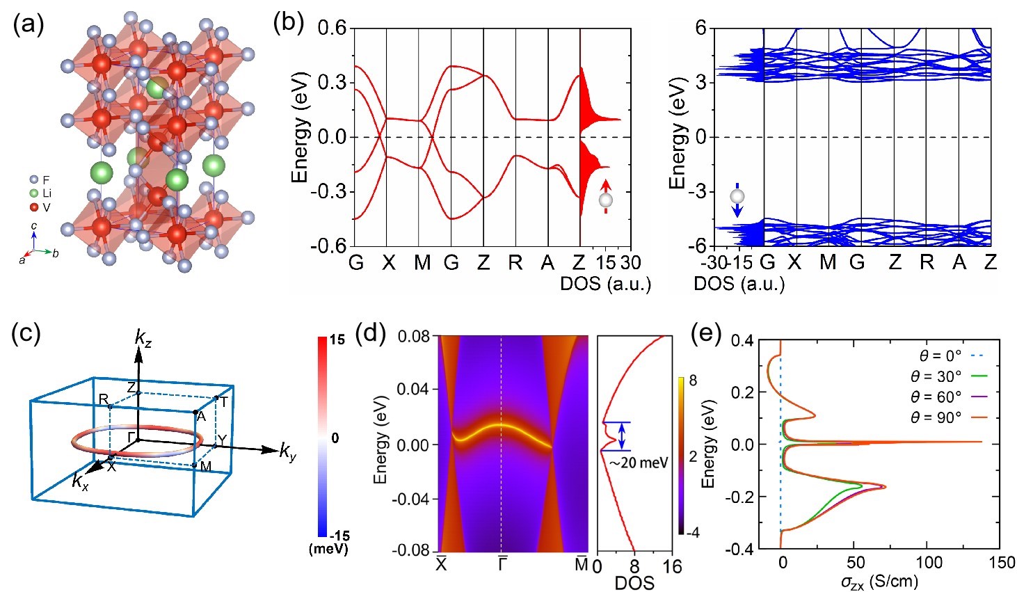 图2: (a)为LiV2F6的晶体结构;图(b)为LiV2F6的自旋极化能带图和态密度图;图(c)为位于 kz =""0的三维节线轮廓图;图(d)为LiV2F6的[001]面的表面色散和态密度;图(e)为在极角 θ = 0°、30°、60°和90°时,本征反常霍尔电导σzx分布图。