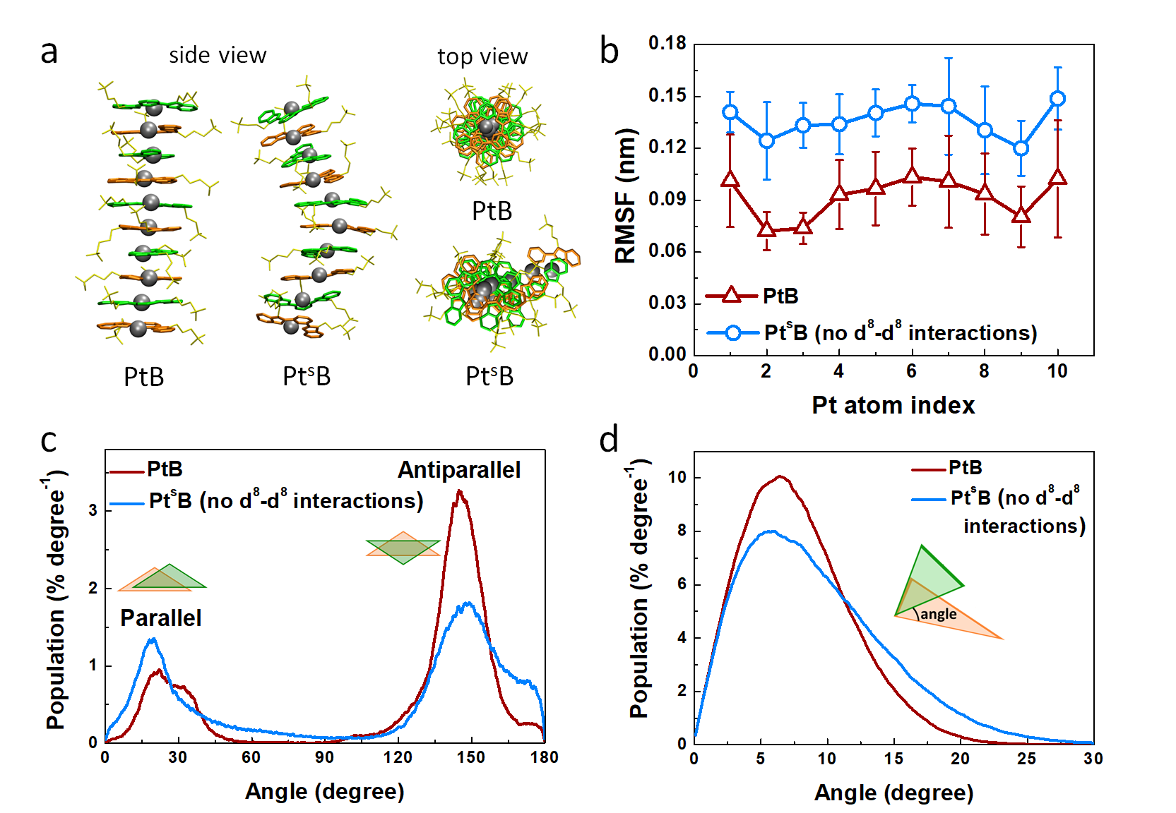 接着,基于新开发的力场参数采用分子动力学模拟,作者考虑了PtB体系、不含d8-d8相互作用的PtsB体系和去掉Pt(II)的Pt-free三种体系的分子组装过程,模拟结果表明,PtB对应十聚体组装结构紧致有序;PtsB对应十聚体松散弯曲;而Pt-free体系则是无归团聚(图4)。肯定了Pt···Pt与π-π相互作用在驱动Pt(II)配合物组装过程和诱导有序结构形成中的重要作用。