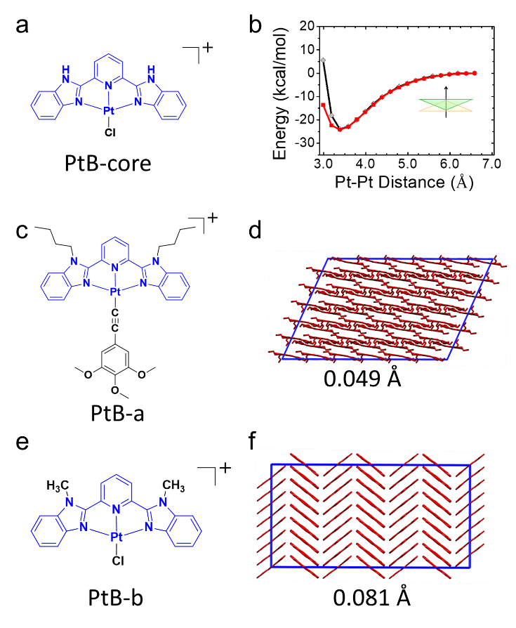 作者进一步开展分子动力学模拟以在微观层面解释PtB的分子组装机理。然而,常用力场库中没有Pt(II)的力场参数,给这类体系分子组装过程的模拟带来极大的挑战。为了揭示Pt…Pt相互作用在PtB自组装过程中的作用,作者开发了一套专门用于Pt(II)配合物分子动力学模拟的力场参数(图2)。通过PtB-core单体及二聚体进行QM和MM计算,发现当Pt-Pt距离∼3.38 Å时,PtB-core分子间相互作用可达-25 kcal·mol-1,此时对应的Pt…Pt相互作用强度为-2.52 kcal·mol-1,与苯二聚体对应的π-π相互作用相当。所得力场参数能够很好的重现先前Pt(II)配合物PtB-a和PtB-b的晶体结构数据,进一步证实了力场参数的可靠性。