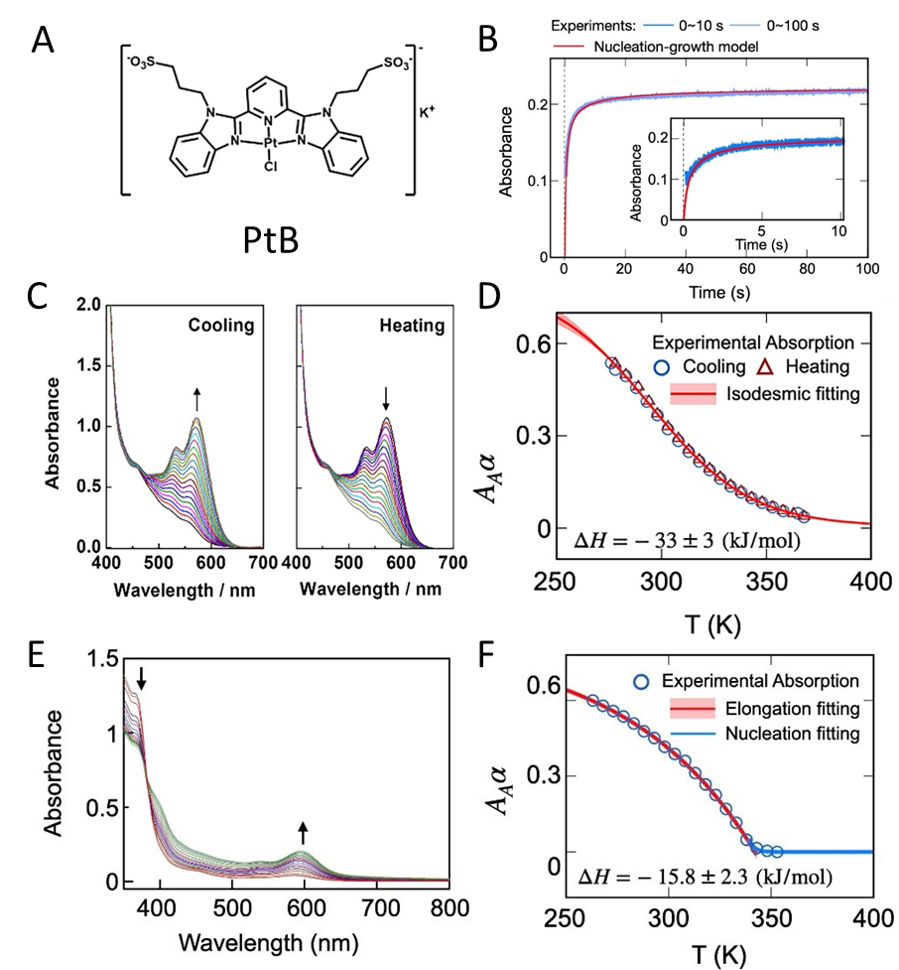 北京成品人和一品二品的区别化学与化工学院李泽生教授团队的郑小燕副研究员、香港科技大学的黄旭辉教授和香港大学的任咏华院士合作对不同溶剂环境下两亲性Pt(II)配合物PtB的分子组装机制进行了系统的研究。由于分子间Pt···Pt相互作用会产生新的光谱信号,通过变温紫外可见光谱可获取平衡态PtB的组装体相对于单体的比例(α)随温度的变化,作者分别通过等键模型(Isodesmic model)和成核增长模型(Nucleation-Elongation model)拟合不同溶剂下PtB的α-T曲线来探索其分子组装体生长机制。研究发现:在纯水溶液中,α-T曲线符合等键增长模型,所得平衡常数分别为Ke300K = 2.4×103 M-1和Ke368K = 2.6×102 M-1;在丙酮和水混合溶液中,α-T曲线符合成核增长模型,所得平衡常数为Ke298K = 2.6×103 M-1和Ke328K = 1.4×102 M-1。同时成核过程对应的平衡常数为5.0×10-6。此外,作者通过Stopped-flow吸收光谱实验测定了PtB在丙酮和水混合溶液中的组装过程动力学。结果发现,实验数据符合成核增长模型:在t=""0.1s时,PtB具有1.1×10-6" M s-1的成核速率,随后成核速率急剧下降直至1.0 s时几乎可忽略不计。在t=""0.1s时,PtB的生长速率为10.6"" s-1,随着PtB单体被消耗和分子组装体间的融合,其生长速率逐渐降低。这一结果表明PtB在丙酮和水混合物溶液中的组装过程符合成核增长形成机制。
