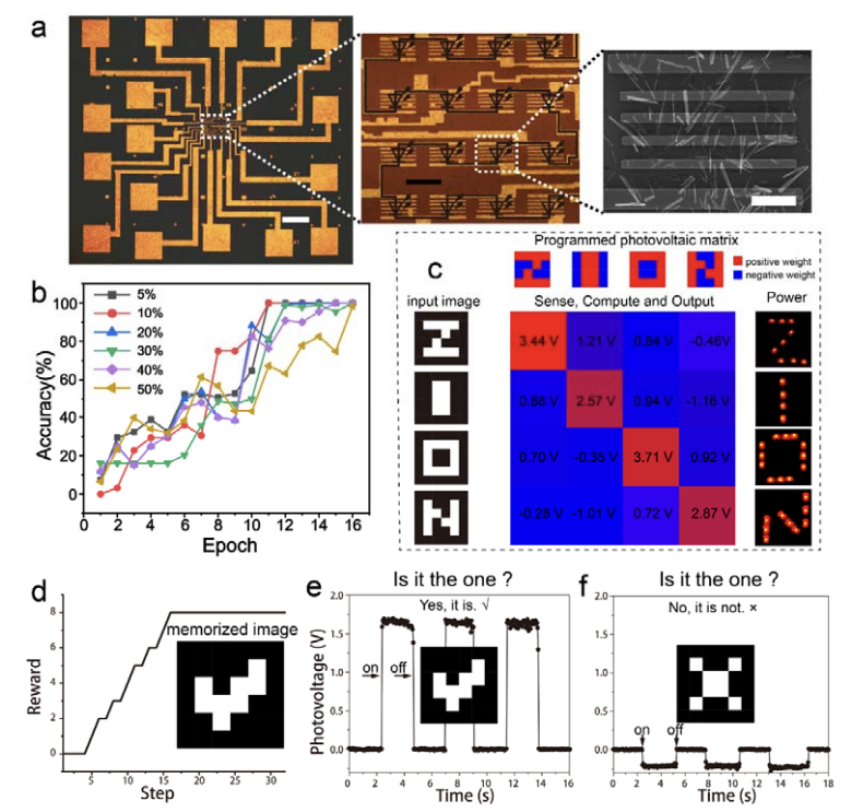 基于这种新型的铁电效应,研究人员对WS2纳米管施加外部电压/电流激励,配合WS2纳米管恰当的禁带宽度,在可见光法位内产生光伏响应的铁电回滞(如图1所示)。WS2纳米管的介观滑移铁电效应使其光伏响应具备可编程且不挥发的光伏特性,因此是一种天然、理想的光伏随机存取存储器(photovoltaic random-access memory, PV-RAM)。研究团队进一步利用该特性制备了16像素的PV-RAM阵列,并利用阵列中每个PV-RAM结构单元的光响应度(即输出光电流与输入光功率的比值)作为神经网络中的突触权重,通过外部电压/电流激励调节权重,实现了神经网络算法在硬件层面的嵌入,并成功演示了基于监督学习和强化学习两种算法的图像识别功能(如图2所示)。这是首次将传感、计算、存储、驱动四种功能集成到基于智能材料的硬件系统中,对于构建未来高速、低功耗甚至自驱动的智能化物联网平台有着重要的参考意义。