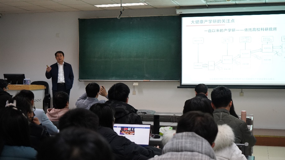 姜雪主任从大健康领域产学研的关注点着手,系统介绍了当前我国临床医院的发展形势及未来发展目标,进而延申到当前临床医院科研能力情况,并以药物临床实验为例讲授了临床医院的科学研究类型。同时,他结合自身多年医学领域成果转化经验提出未来临床医院科学研究的新定位。讲座最后,他介绍了所在单位的科技成果转化情况。在互动提问环节,姜雪主任针对参会人员提出的有关医学成果转化难点、领域发展趋势等问题进行逐一耐心解答。